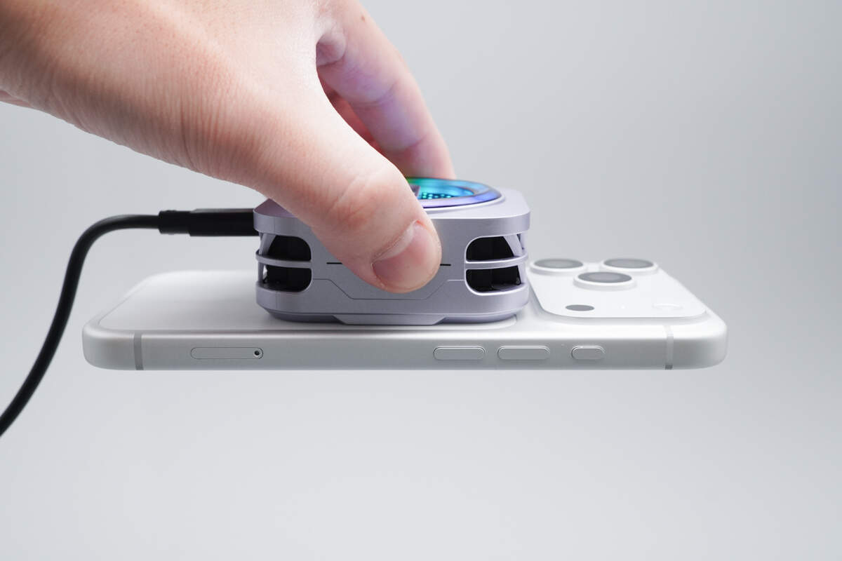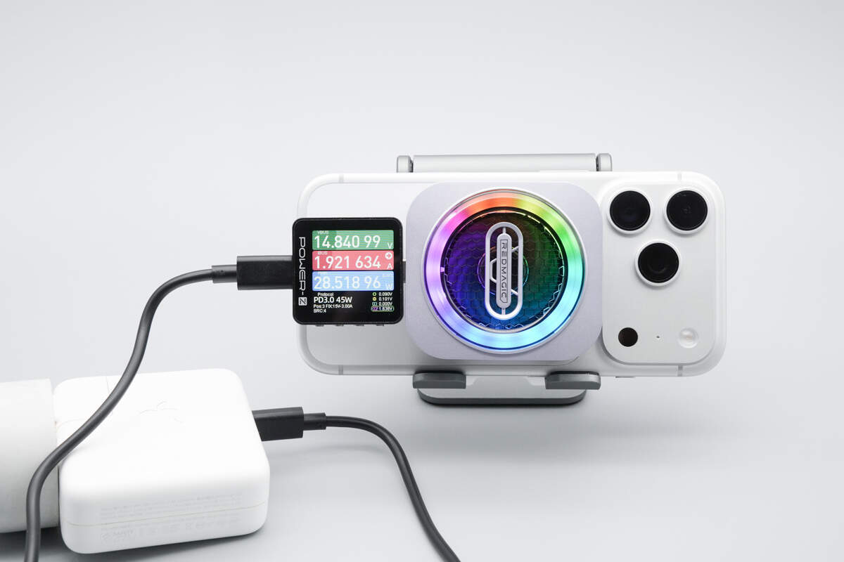 吸附力方面,红魔散热器6 Pro可轻松吸附起苹果iPhone 17 Pro悬空不掉落。