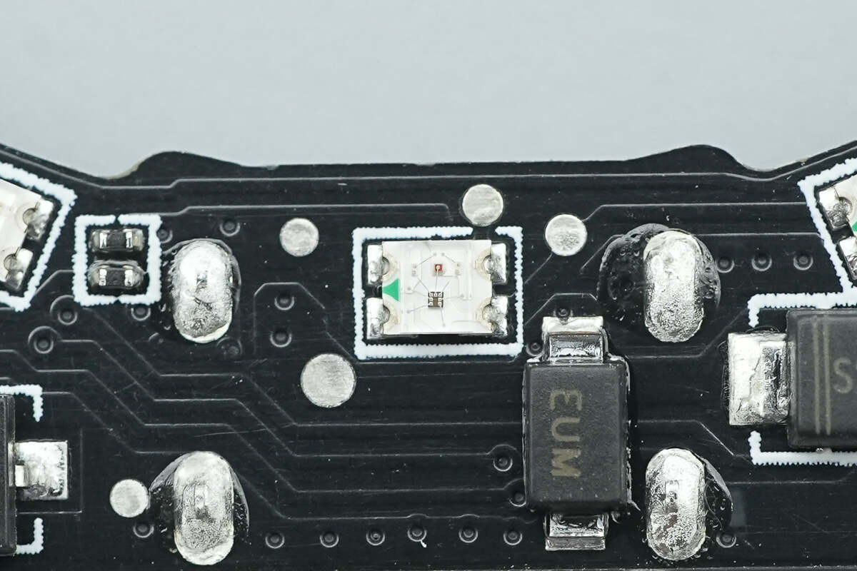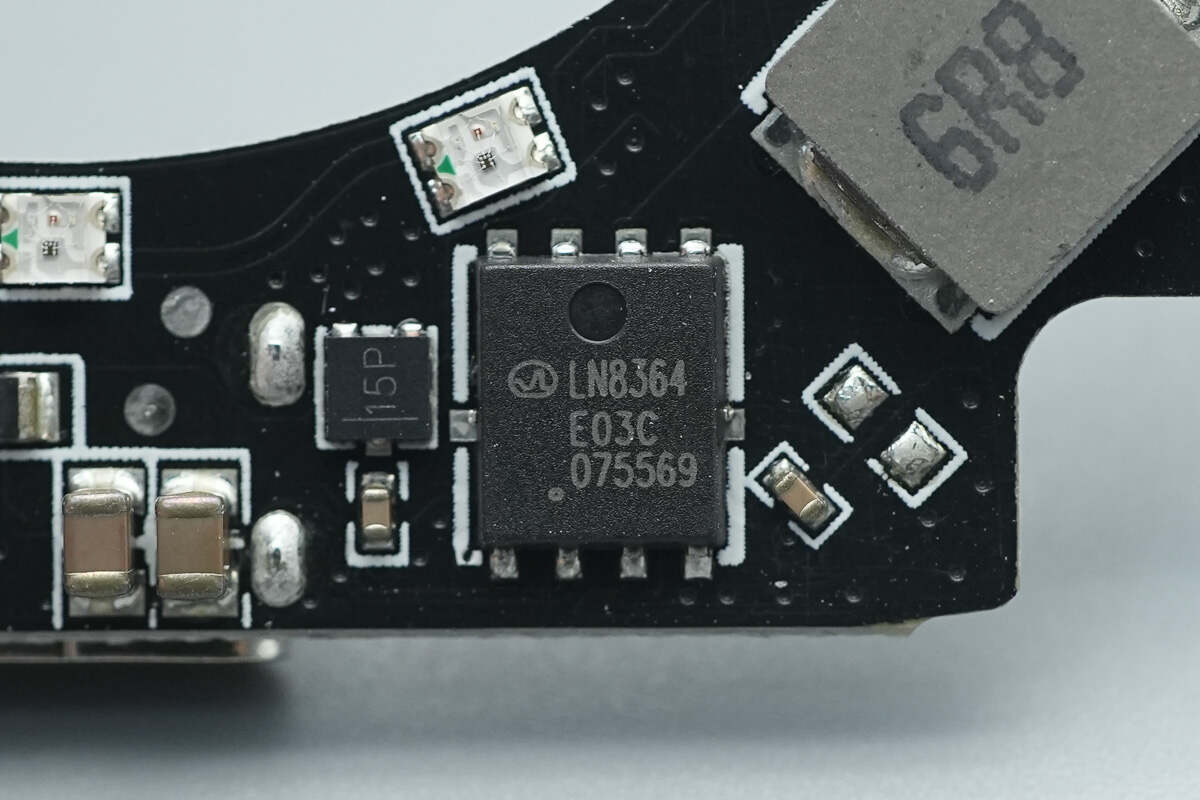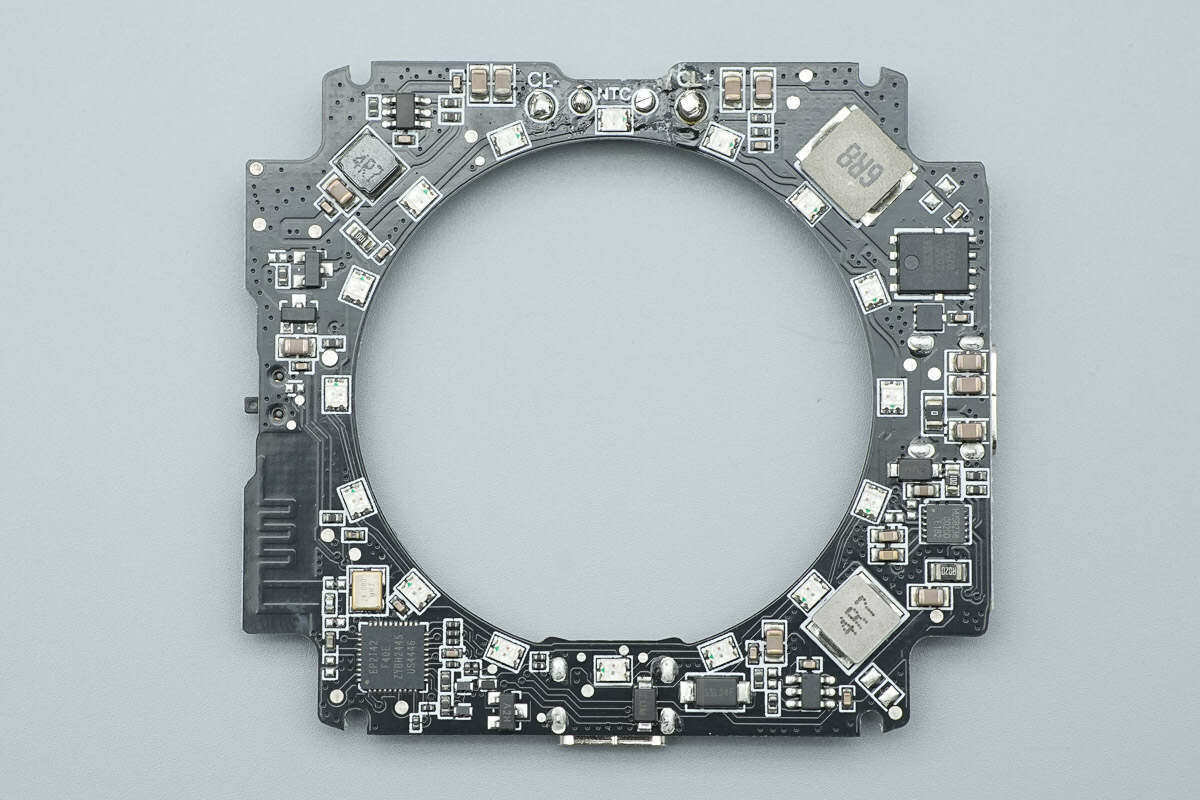 PCB板正面设有PD取电芯片、蓝牙SOC芯片、半桥芯片、同步降压转换器以及电感等器件,可寻址RGB LED灯共16颗。