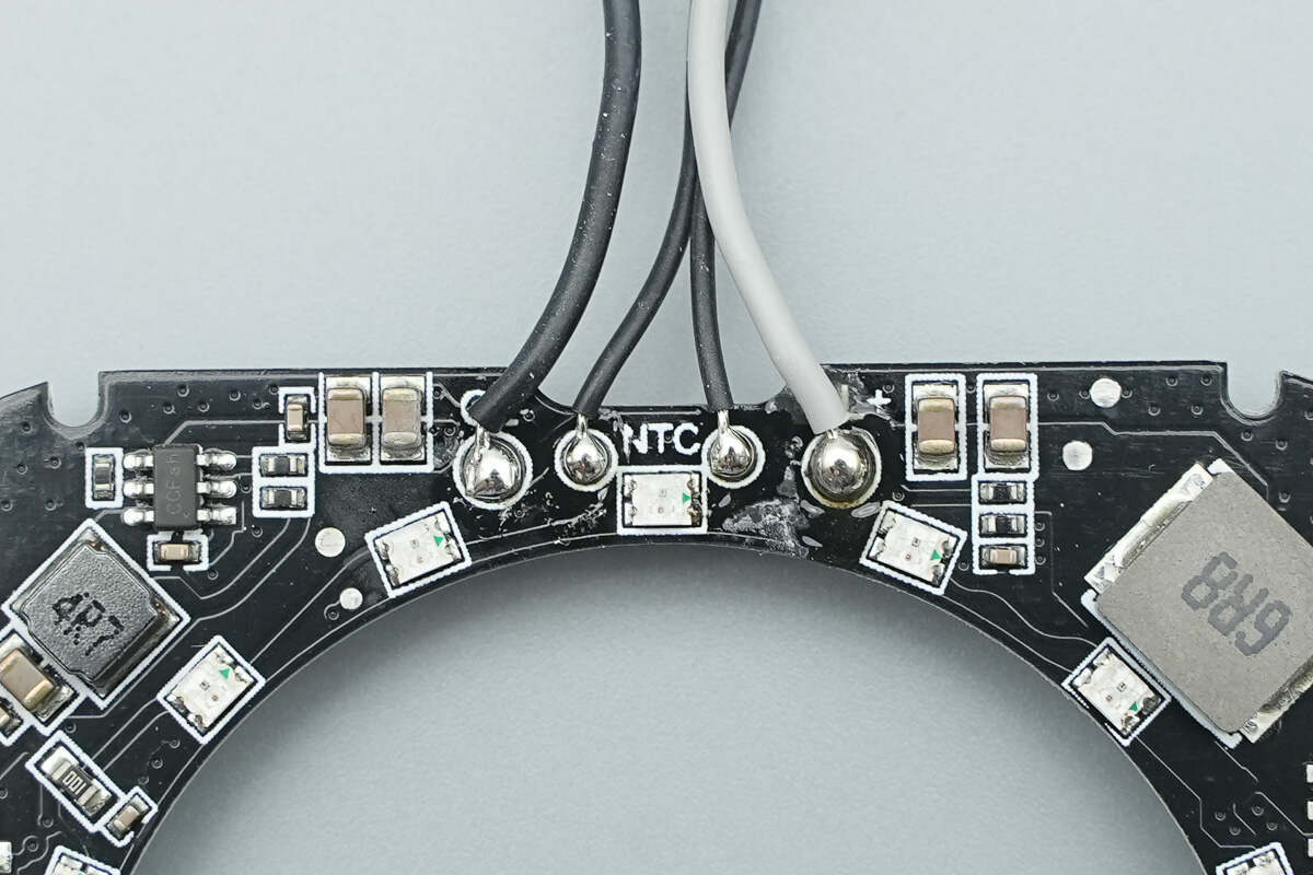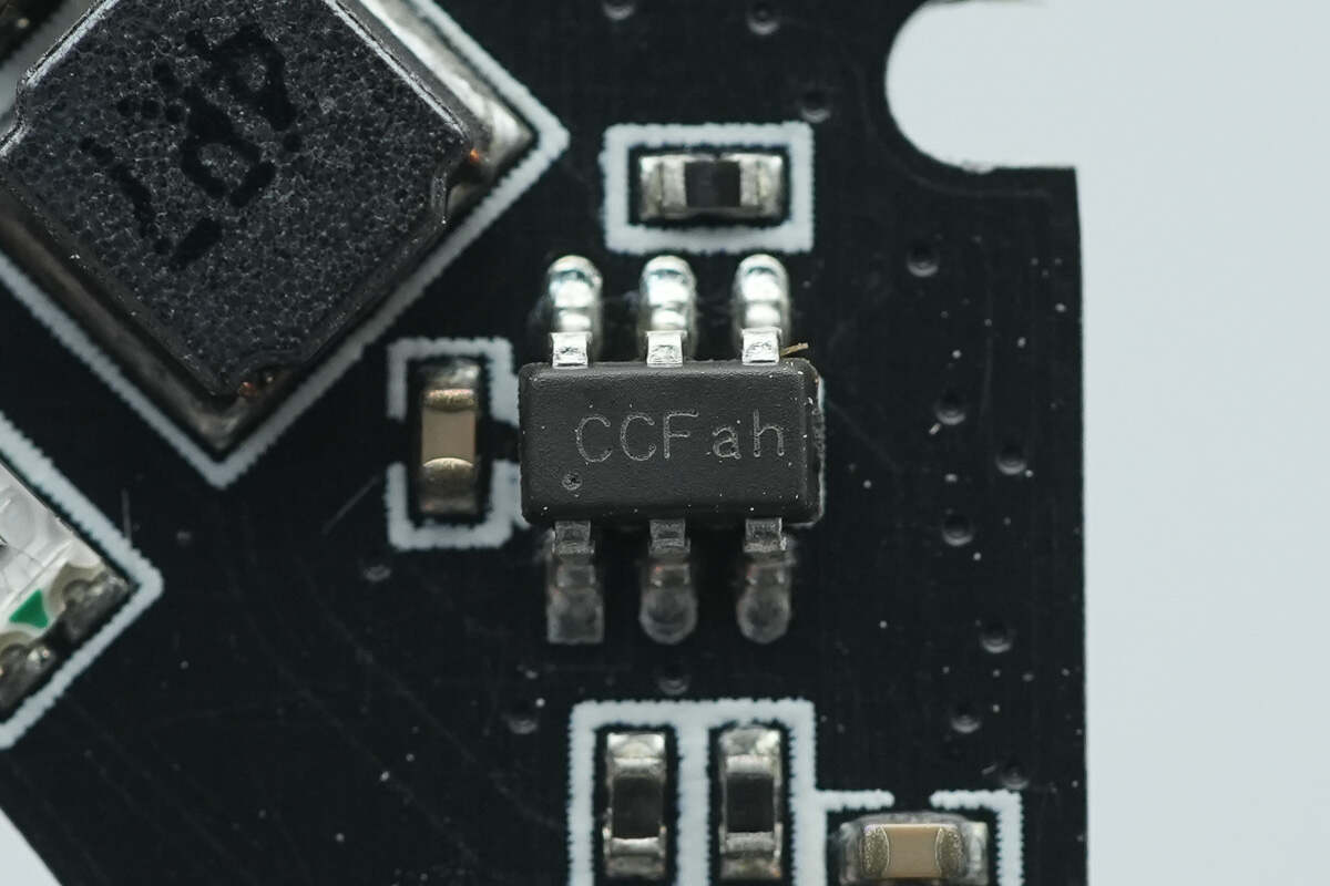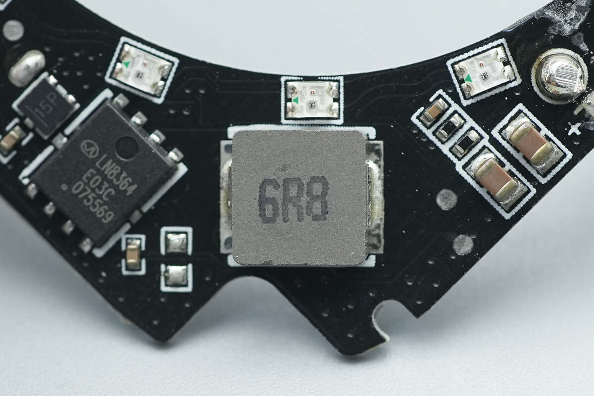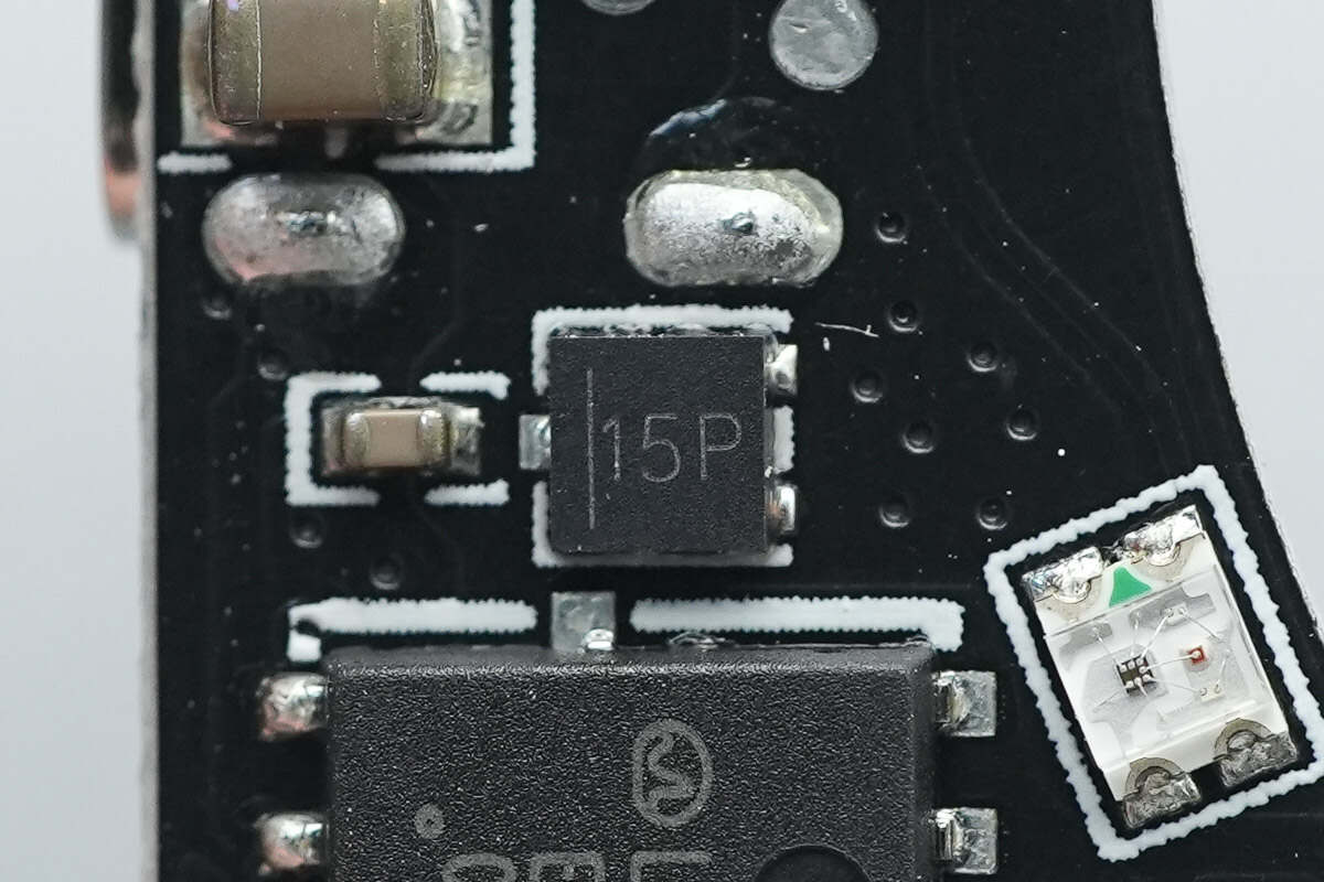 PCB板正面设有PD取电芯片、蓝牙SOC芯片、半桥芯片、同步降压转换器以及电感等器件,可寻址RGB LED灯共16颗。