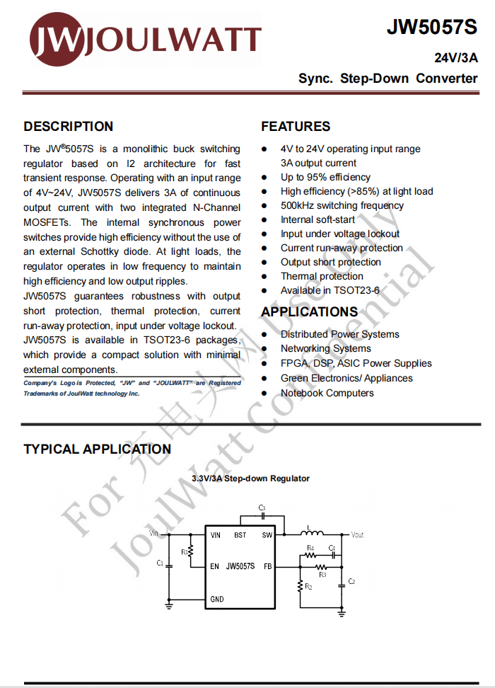 在轻载条件下,JW5057S以低频模式运行,从而保持高效率与低输出纹波。此外芯片具备输出短路保护、热保护、电流失控保护及输入欠压锁定等多重保护机制,确保系统稳健运行。该器件采用TSOT23-6封装,仅需极少外部元件即可构建紧凑的解决方案。