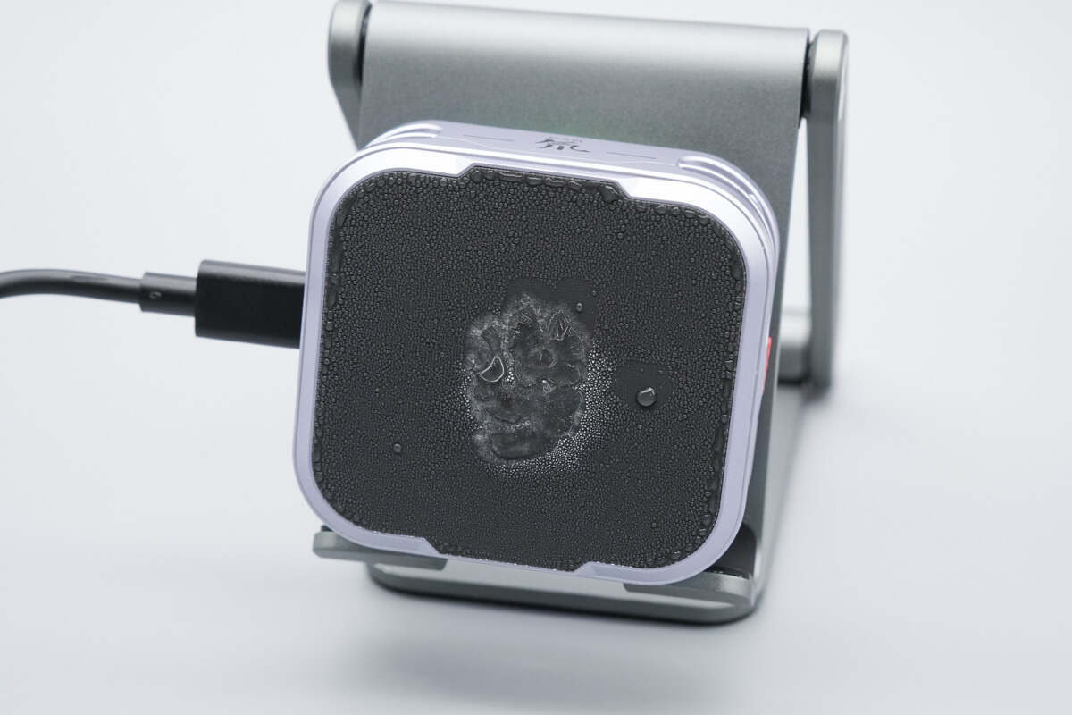制冷方面,给红魔散热器6 Pro通电后静置运行一会,制冷面便会凝结水珠,中心区域甚至结冰,可见制冷效果相当给力。