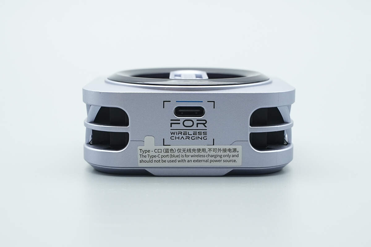 机身一侧设有用于为无线充电模块供电的USB-C接口,一旁贴有提示贴纸。
