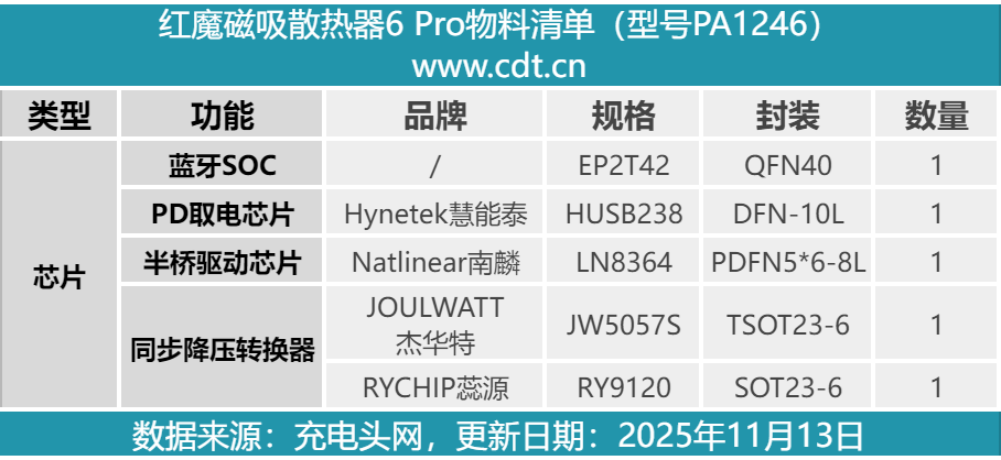 最后附上红魔磁吸散热器6 Pro核心器件清单,方便大家查阅。