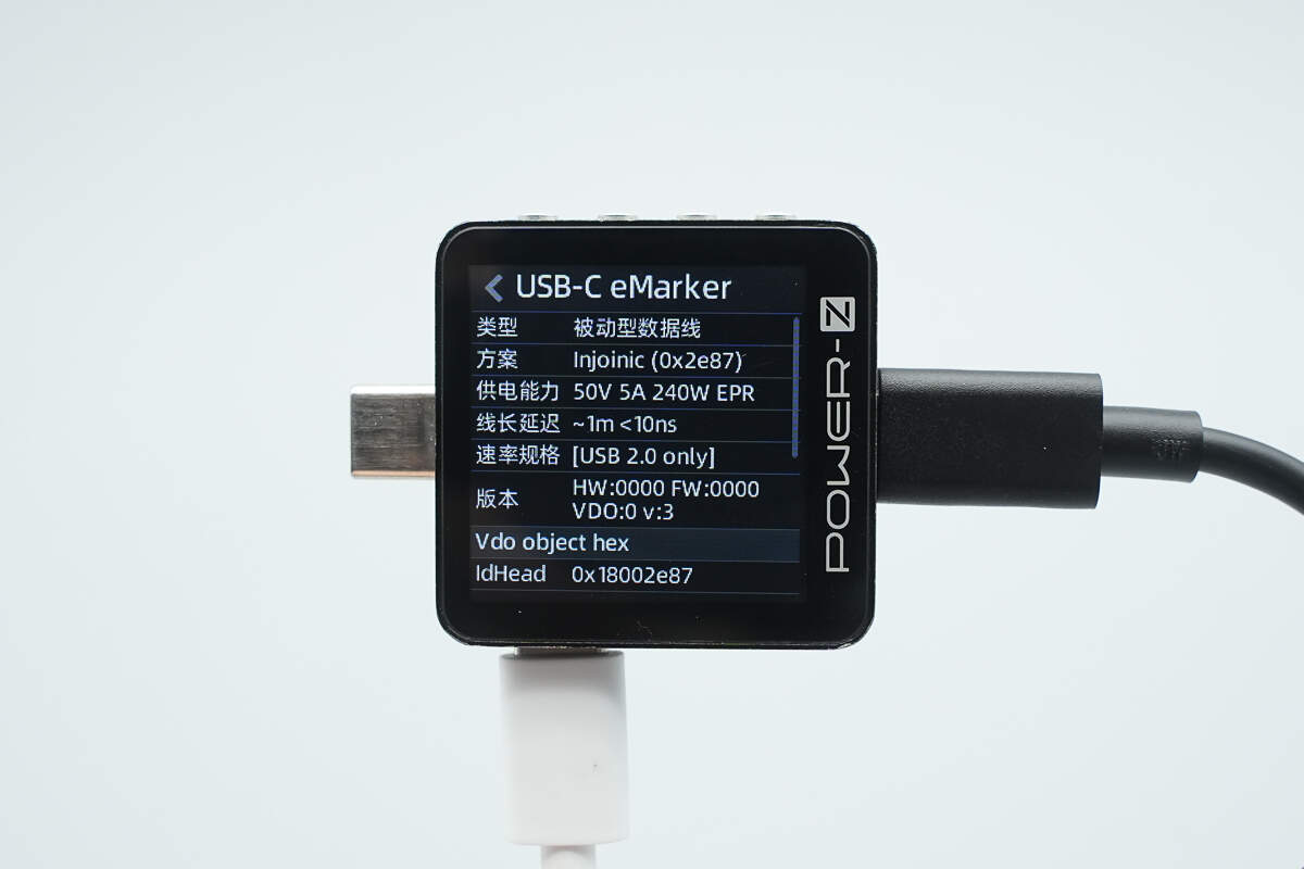 使用ChargerLAB POWER-Z KM003C测得线缆带有E-Marker芯片,电力传输能力为50V5A,数据传输能力为USB 2.0。