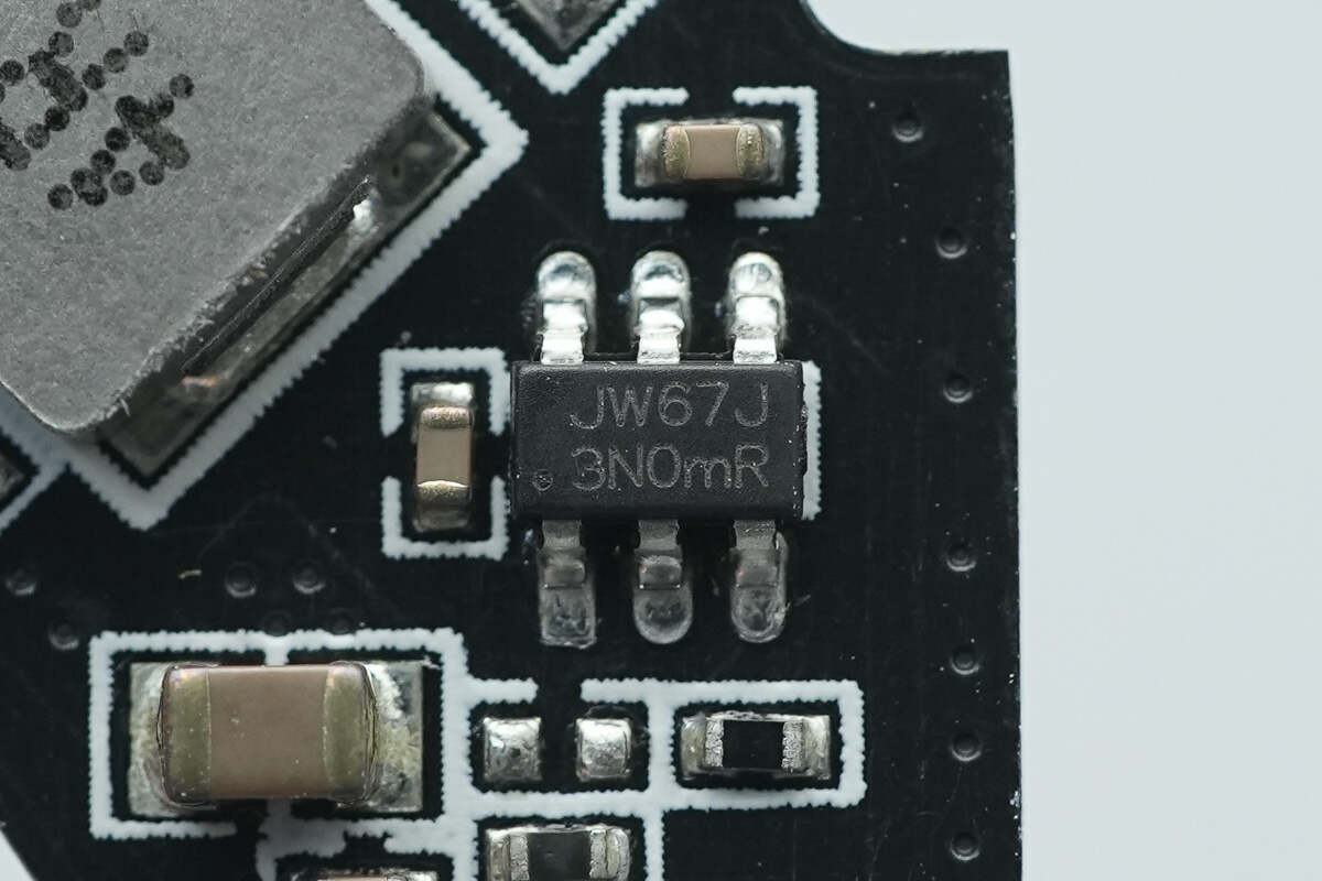 另一颗同步降压转换器来自杰华特,丝印JW67J,实际型号为JW5057S,芯片支持4-24V宽输入工作范围,通过内部集成的双N沟道MOSFET可提供3A的连续输出电流。其内置同步功率开关管无需外接肖特基二极管即可实现高效能转换。
