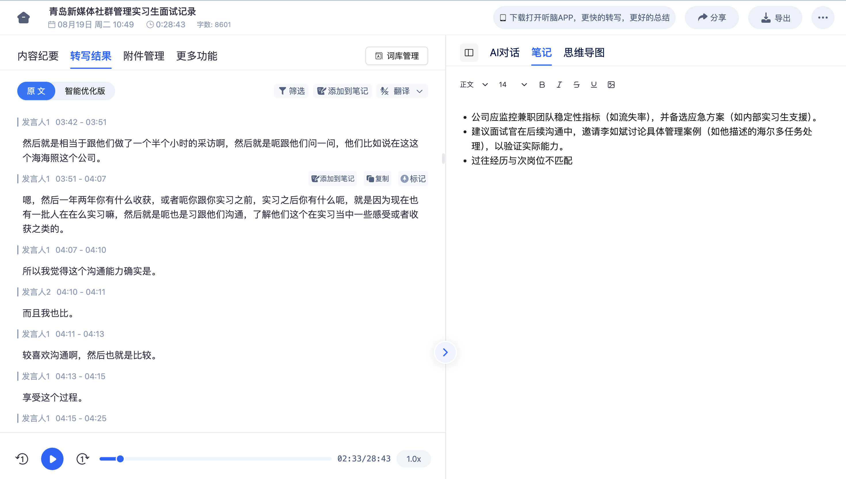 作为一个经常被论文调研、小组作业折磨的学生,我觉得听脑AI这次的更新真的解决了很多实际问题——面试准备时,用它记录模拟面试的回答,能发现自己说话的漏洞;论文调研访谈时,实时转写专家的观点,不用一边记一边听,能更专注于提问;语言学习时,发音纠正和进度跟踪比外教还方便。之前我吐槽小组作业协作效率低,论文调研记录困难,现在用了听脑AI,这些问题都迎刃而解。比如上周的论文调研访谈,我用它实时转写,2小时的访谈转写后自动分段,提取了“青少年心理健康干预措施”“校园心理咨询师配置”等关键词,自动生成了待办事项“整理干预措施案例”,本来要2小时整理的内容,2分钟就搞定了。