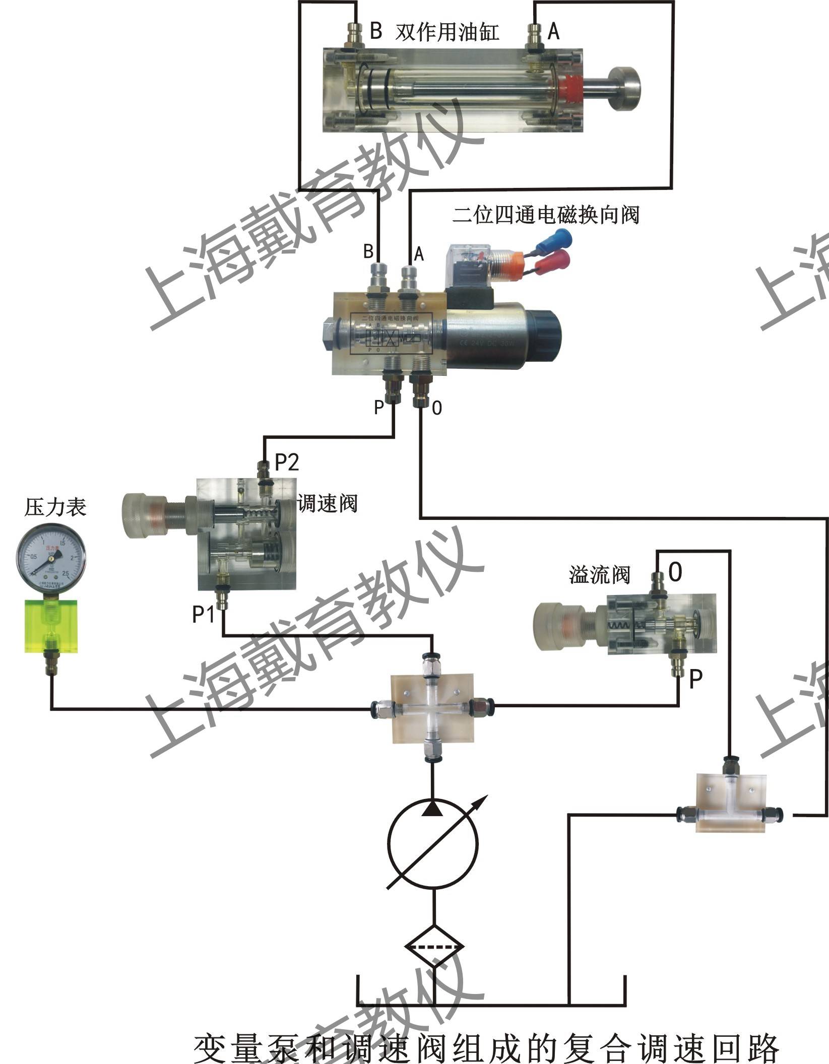 本实验用变量和节流阀(或调速阀)相配合来进行调速的方法,通常称为容积节流复合调速。这种调速方法具有工作稳定,效率较高的优点。