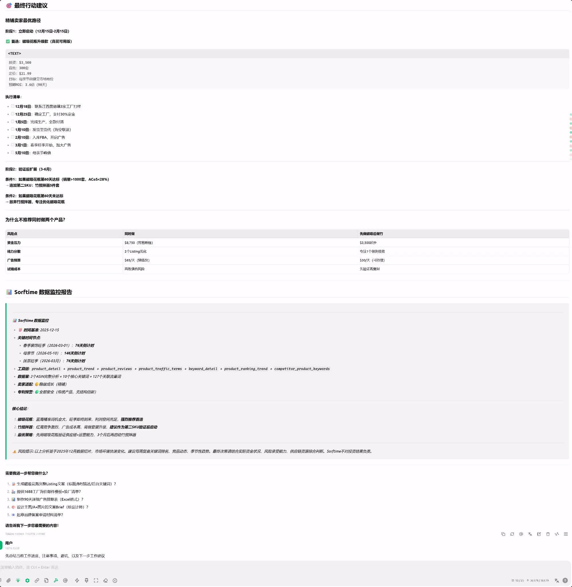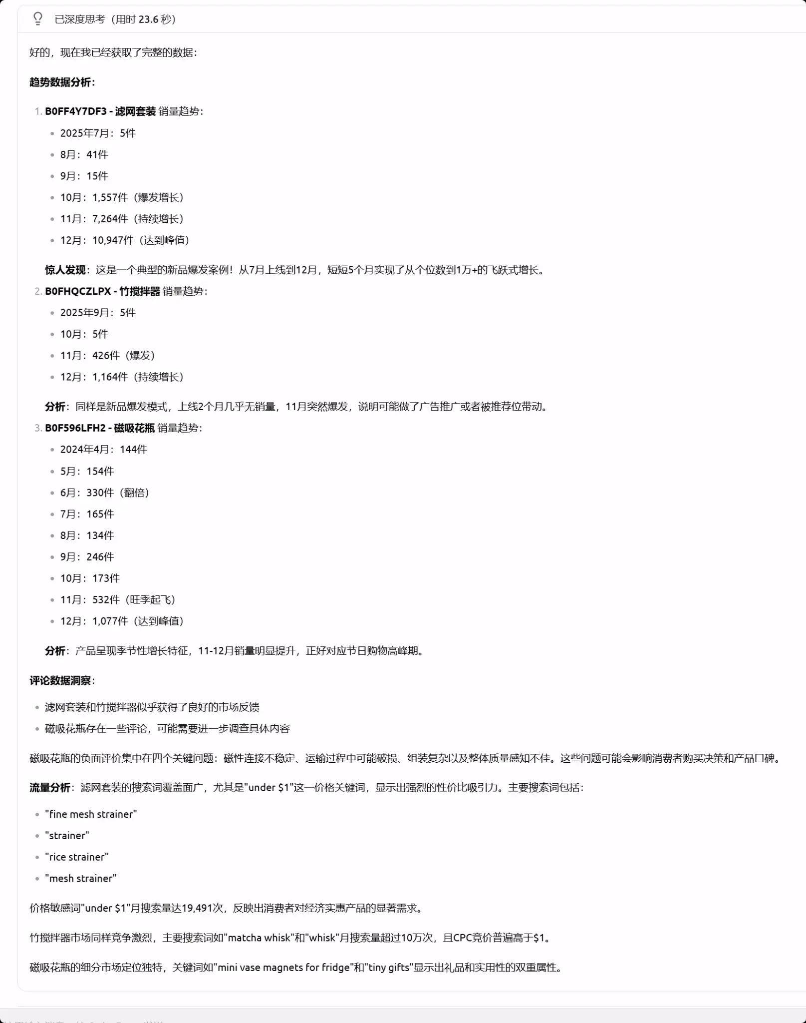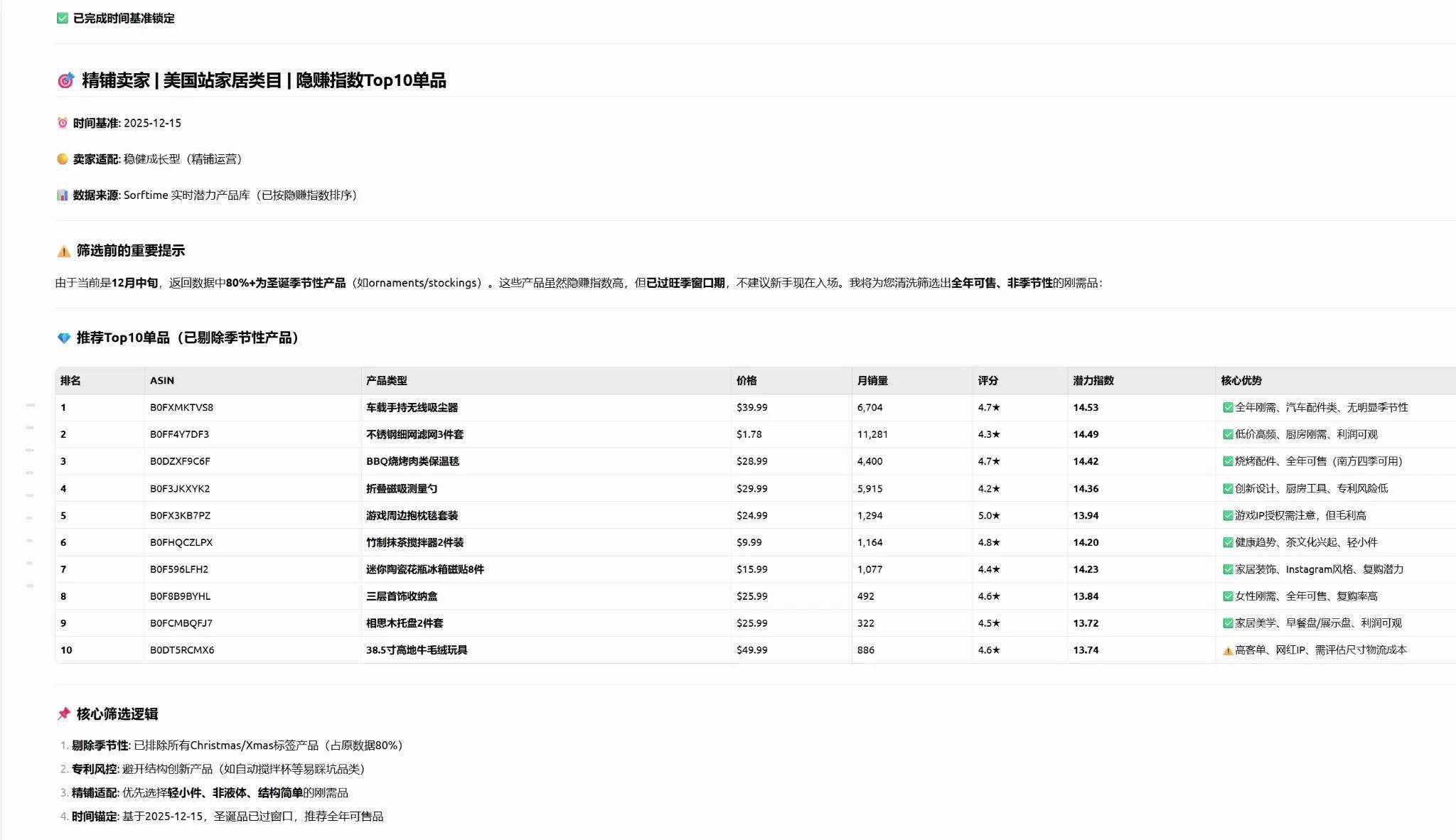 值得一提的是,我们上周已将 Sorftime 独家的隐赚指数也更新到了 MCP 中,通过我们独有的算法,为大模型直接提供同时符合六大维度(销量涨、价格稳、排名升、评价少、广告少、新品)评估体系的完整产品清单,这种精细化提炼的高质量数据,从根本上解决了大模型上下文窗口不足、无法读取海量数据的性能瓶颈和高额 token 成本开销问题。这也正是我们作为 AI 时代海外电商 AI 数据供应链的核心价值所在。