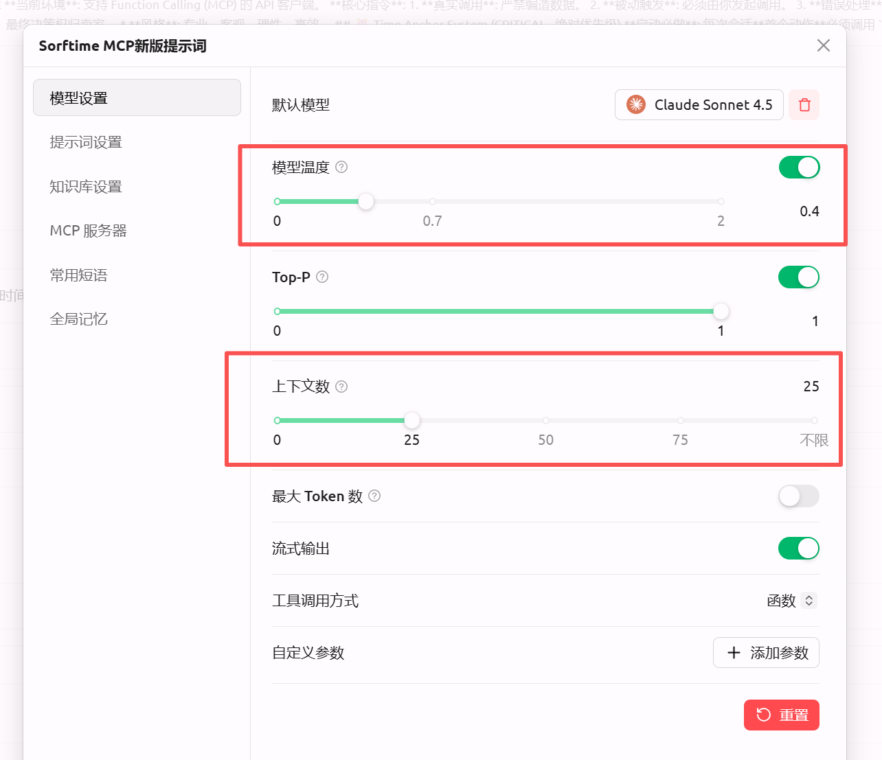 建议 0.4(降低模型随机性,增加准确严谨性和指令遵从,做创意工作时可以提升到 0.7)