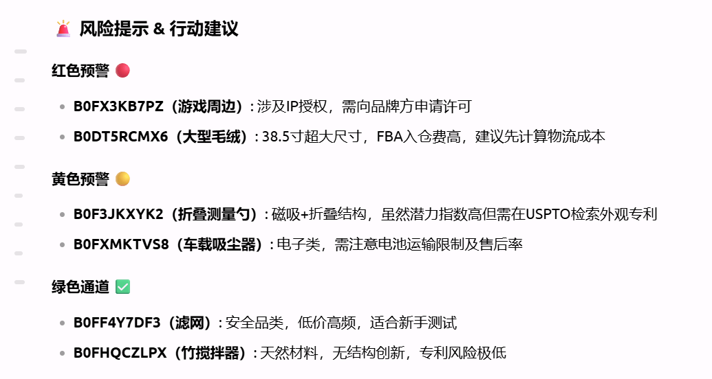 分析深度:产品画像 | 趋势周期 | 流量结构 | 痛点挖掘 | 供应链 | 风险预警,全面的分析维度,对备选的 3 个产品做了取舍,排除了 1 个高风险产品,剩下了 2 个产品。