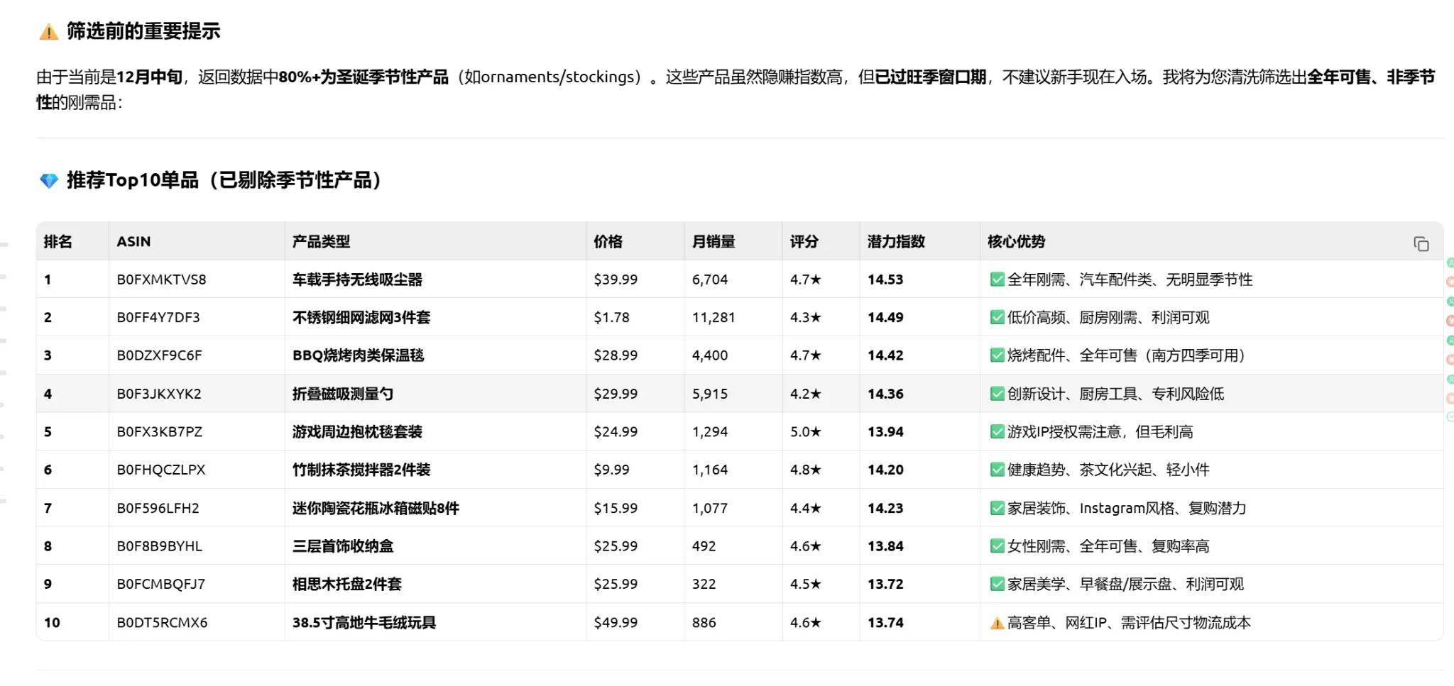 Claude 判断卖家为稳健成长性(精铺运营),还分析了当前时间点的机会窗口期,初步得出 10 个推荐单品(已剔除季节性产品)。