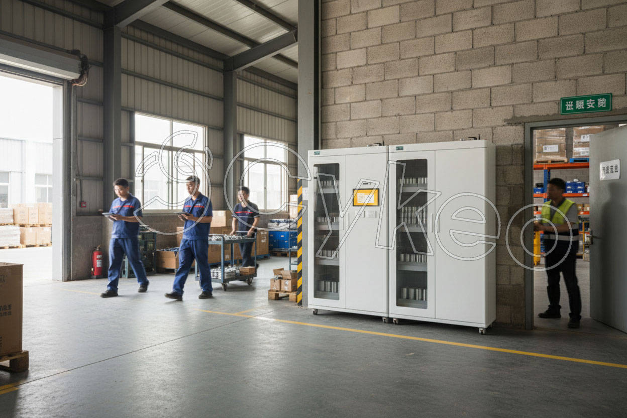 斯科CK-GGT1智能称重柜放置在生产物料管理场景中,展示称重和储存功能