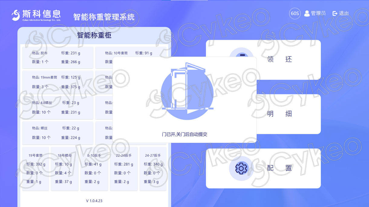 斯科CK-GGT1智能称重柜管理系统界面展示,实时监控工具和物料数据