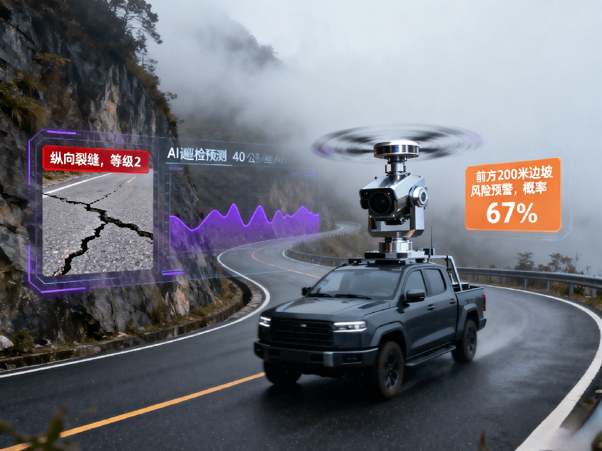 一辆AI巡检车正以40公里/小时的速度匀速前行,车顶的视觉传感器和激光雷达以毫米级精度捕捉路面信息。与此同时,固定摄像头、无人机在空中盘旋,组成了一张无死角的监控网络。在后台,AI系统正在分析海量数据,精准识别路面病害与异常事件,整个流程无需人工干预。