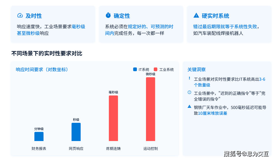 及时性好理解,就是响应速度快。但多快算快?在一条先进的炼钢连铸生产线上,对温度、压力等关键参数的采集时延,要求控制在5毫秒以内 。在一些高精度的运动控制场景,这个数字甚至要缩减到微秒级 。相比之下,传统IT系统秒级的响应,在工业控制领域就像是“慢动作回放”。