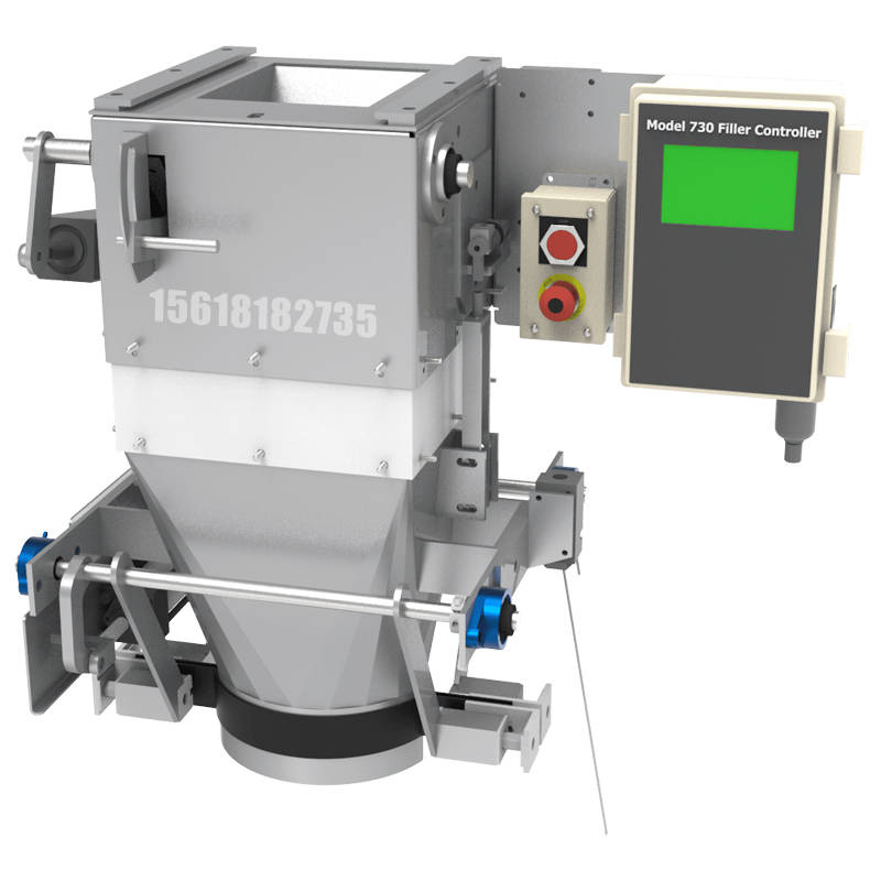 将吨包装袋套在加料嘴上,将包装袋四角挂在气缸上,按动“开始”按钮,这时压袋气缸开始工作并压住袋口,气缸将包装袋四角撑开,控制器将包装袋重量自动去除,螺旋转动迅速将物料灌入袋中,振动台开始振动将物料振实,随袋中空气一起溢出的粉尘通过吸尘器由除尘器吸走,待加料快到设定值时,螺旋转速减速慢加,振动停止,到设定值时,加料停止。这时压袋气缸松开袋口,气缸将包装袋四角松开,铲车将包装袋送出。