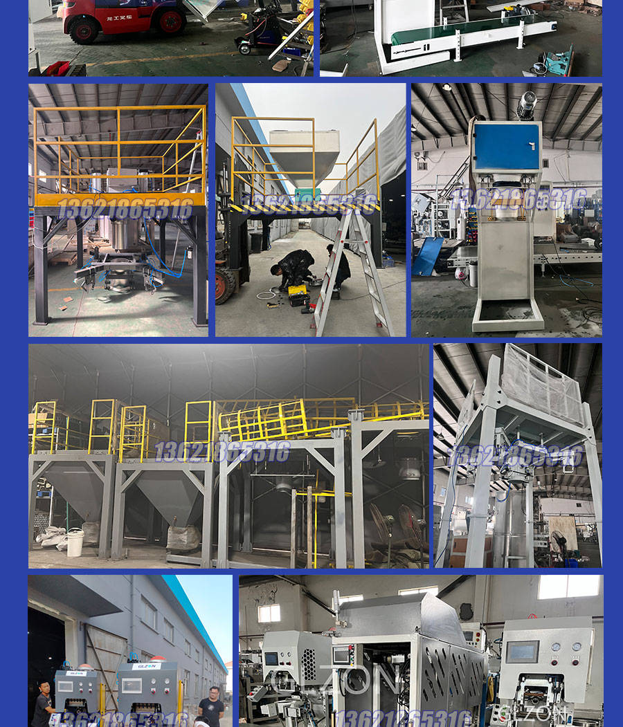 1.包括PLC控制、夹袋、吹袋、喂料、计量充填、排气、落袋、托盘、配送、成品袋输送均为自动化,工人只需挂空袋和袋子进料口打结;