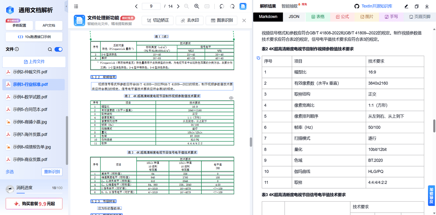 ● 文档上传与初始识别:将含复杂表格、多元素的目标文档(如行业报告、论文、合规文件等)上传至 TextIn 平台,工具会自动启动多模态元素扫描,快速定位文档中的表格、文本、手写体、印章、图表、公式等核心元素,完成初步分类,为针对性解析奠定基础。