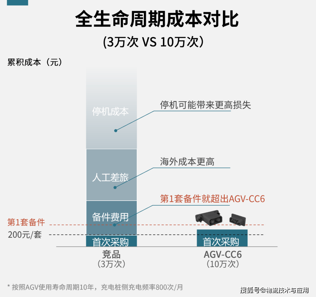 在移动机器人整个生命周期中,与仅有3万次插拔寿命的充电连接器相比,史陶比尔AGV-CC6连接器凭借其高达10万次的插拔寿命,展现出了更为显著的成本效益。具体而言,在10年的使用周期内,AGV-CC6仅需承担首次采购成本,而竞品在更换第一套备件时,其累积成本已远超过AGV-CC6,更不用说AGV-CC6还节省了大量的人工成本以及难以预估的生产停机成本。同时,史陶比尔也在持续推进本地化降本,使得AGV-CC6在性价比方面更具优势。