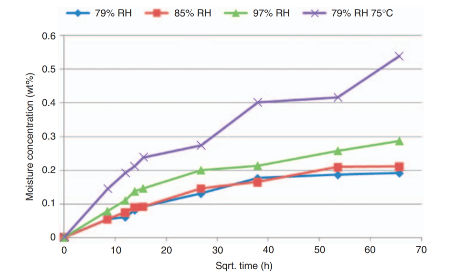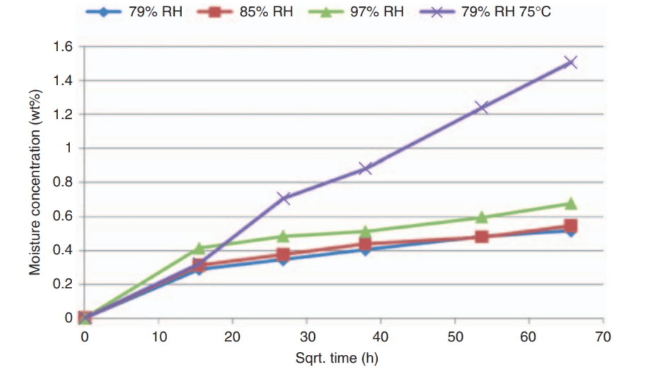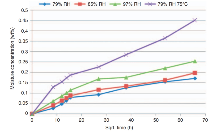 湿度引起的性能退化往往与聚合物基体吸收水分的程度密切相关。对于大多数实际应用,含水量百分比的变化可以通过重量法测量,即测量聚合物试样重量或质量的变化。其计算公式如下: