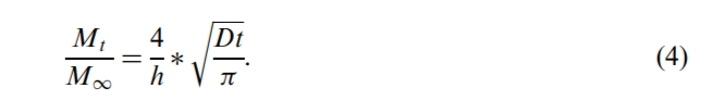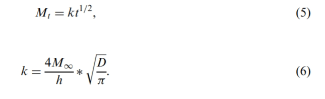 在吸湿初始阶段,当 Mt / M1 < 1/2 且假设扩散系数D为常数时,可由以下公式近似表示: