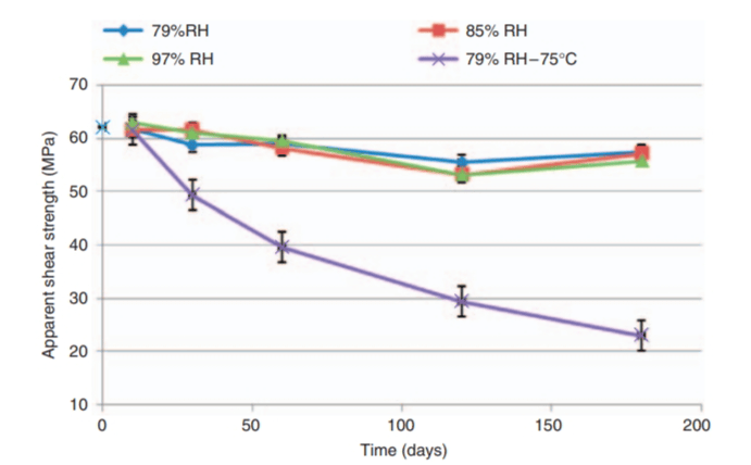 图10:在室温和高温条件下老化的绝缘试样其层间剪切强度随时间(天数)的变化曲线。该曲线展示了高温对S2玻璃纤维/CTD-403绝缘试样层间剪切强度的影响。
