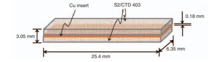 复合材料绝缘试样的制备过程如下:将S2玻璃纤维层置于密闭模具中,在低于200毫托的真空压力下于50摄氏度环境中预处理至少3小时。对玻璃纤维增强材料进行此次初始烘烤,旨在排出模具及织物内的所有空气。随后,将CTD-403树脂在50摄氏度下真空脱气45至60分钟。脱气后的树脂被注入模具以浸渍编织织物。真空压力浸渍工艺完成后,层压板在峰值温度150摄氏度下固化4小时。铜/绝缘试样在S2玻璃纤维层中心位置放置了一片厚度为0.18毫米的铜箔。