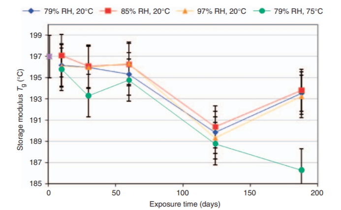图14:平均玻璃化转变温度随暴露时间变化曲线。该图展示了纯树脂试样在湿度/温度暴露作用下玻璃化转变温度下降的情况。