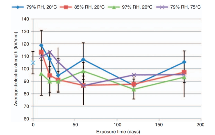 图13展示了长达6个月暴露期内湿度老化对平均介电强度的影响。在79%、85%和97%相对湿度条件下暴露6个月后,试样的介电强度保持率分别为99%、93%和90%。所有试样在室温老化6个月后平均介电强度达到98.6千伏/毫米。温度对绝缘材料介电强度的影响较小。在75摄氏度老化6个月的试样平均介电强度保持率为91%。