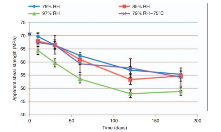 在室温条件下,两种试样的层间剪切强度均随时间和相对湿度增加而下降。高温条件对绝缘试样的影响较小。而铜/绝缘试样在高温下层间剪切强度显著下降,表明铜箔/基体界面发生失效。室温条件下铜/绝缘试样的强度保持率为92.5%,而高温(75摄氏度)老化后保持率仅为37%。