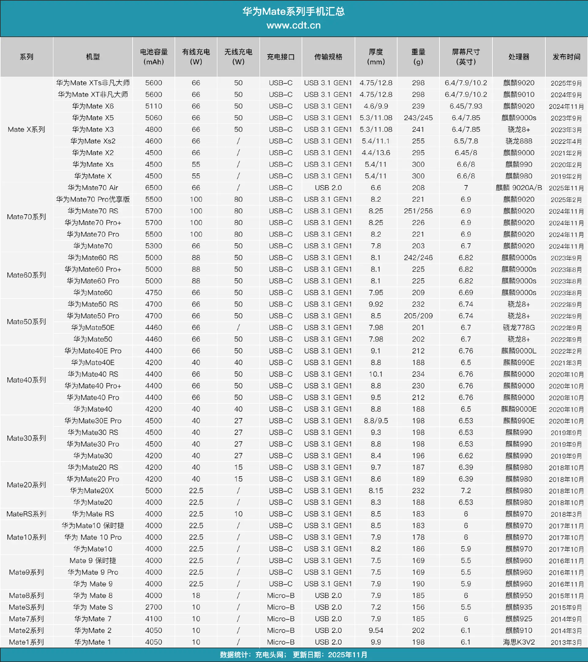 充电头网也汇总了华为历代Mate系列机型,可以看到随着时代的发展电池容量从4050mAh到如今最高的华为 Mate70 Air是6500mAh,从10W充电到100W快充,这张图也展示了Mate系列机型的发展史。