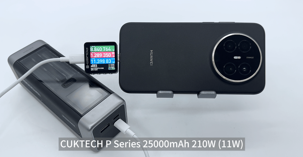 CUKTECH P Series 25000mAh 210W充电宝为华为Mate70 Air充电,同时使用POWER-Z KM003C测试仪读取充电功率为8.84V 1.29A 11.40W,握手的协议为PD协议。