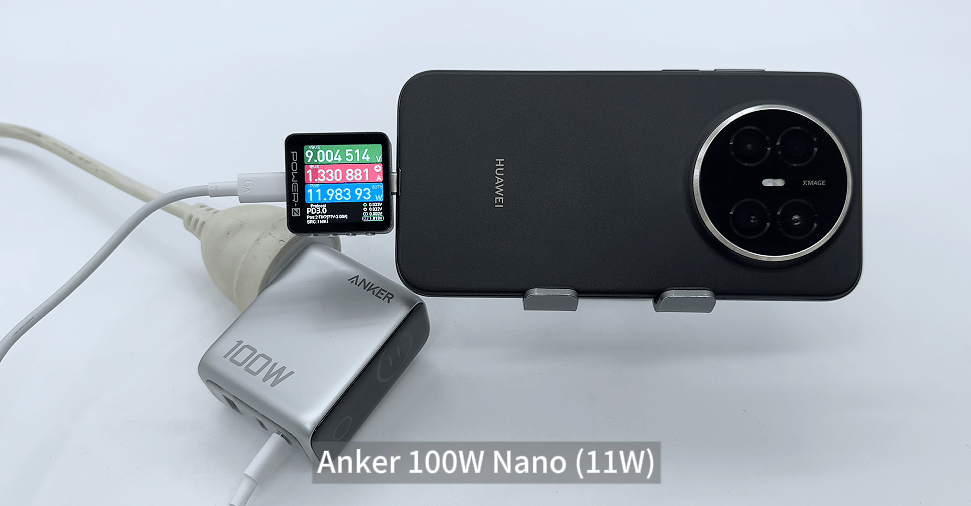 使用Anker 100W充电器为手机进行充电,使用 POWER-Z KM003C 测试仪读取充电功率为9.00V 1.33A 11.98W,握手的协议为PD协议。