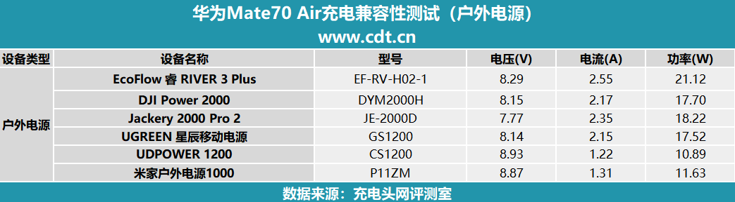 将户外电源测试数据汇总至表格,可以看到所测设备均握手8-9V电压。电流方面,多数在1.3-2.6A区间。