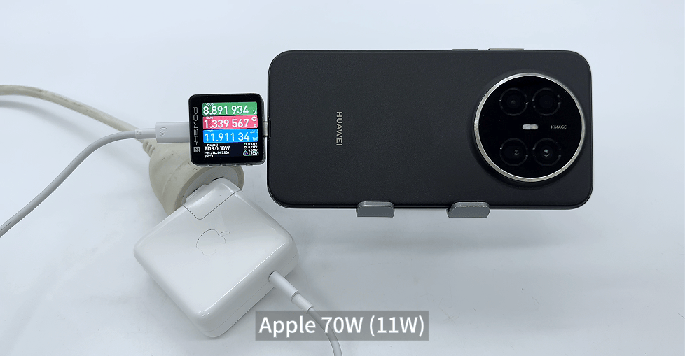 使用Apple 70W充电器为手机进行充电,使用 POWER-Z KM003C 测试仪读取充电功率为8.89V 1.34A 11.91W,握手的协议为PD协议。