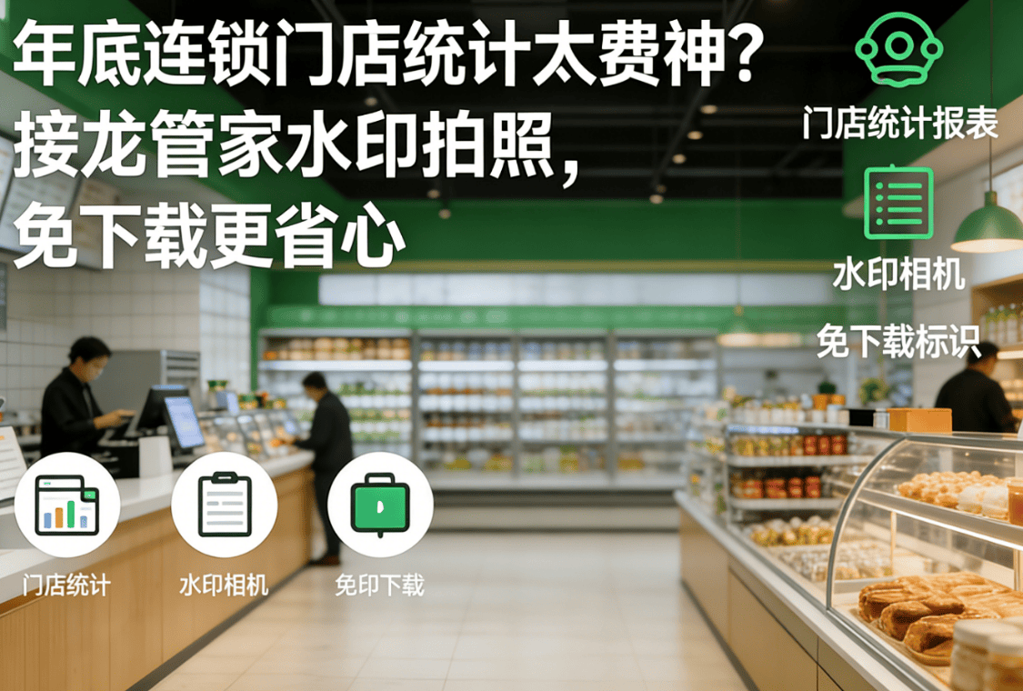 作为日活超 500 万的一站式数据收集平台,接龙管家自带水印拍照功能,完美解决连锁门店的统计需求,不用额外下载,数据管理一步到位!