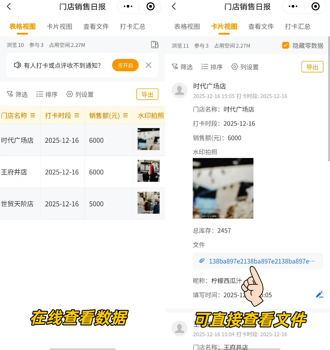 其次是功能太单一,统计效率低。大部分水印相机就只会拍照加水印,但门店要统计的可不止照片 —— 销售数据、库存数据都得报。管理者得在群里翻来翻去找,手动汇总累得够呛。