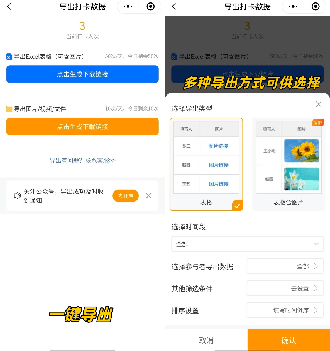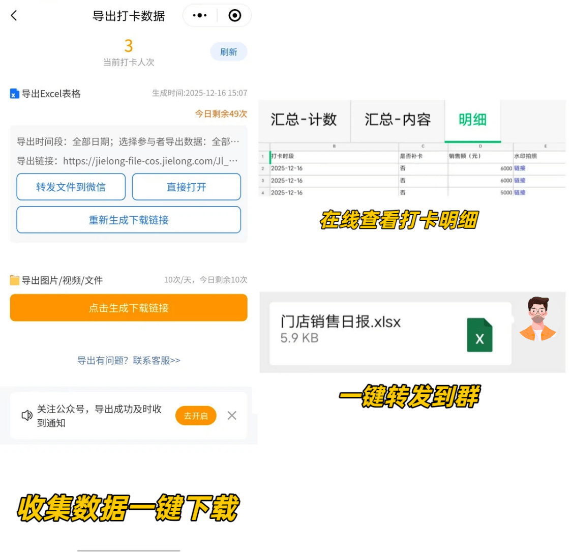 收集完所有门店的数据,点一下就能导出带图片的 Excel 表,不用手动整理,直接转发给同事看。
