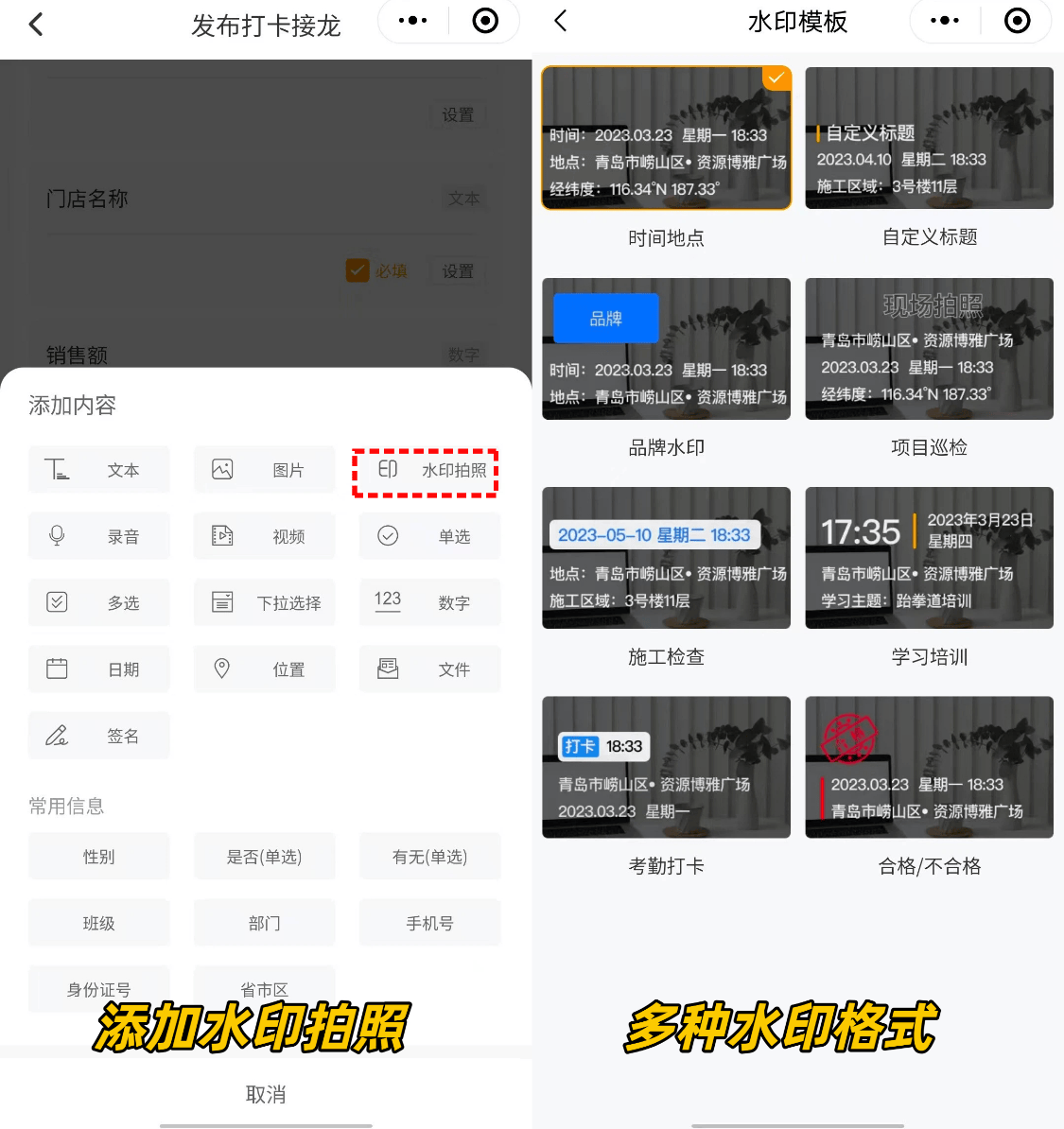 任务里能加 “水印拍照” 模块,检查库存、卫生情况时用 —— 水印模板有好几种可选,照片里的时间、地点都是系统自动填的,真实可靠。