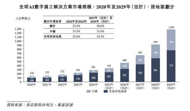 全球AI数字员工解决方案市场近年来保持快速增长,从2026年的118亿元增长至2024年的291亿元,期间实现25.3%的复合年均增长率。得益于企业流程自动化、生成式AI等技术的融合应用,AI数字员工逐步演进为具备语义理解与决策能力的智能体,在金融服务、政务、制造及零售等领域的应用范围持续扩大。预计2025 年至2029年全球市场将以40.0%的复合年均增长率增长,到2029年达到1,287亿元。