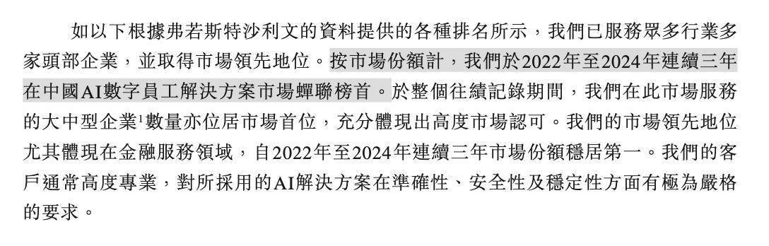 根据弗若斯特沙利文的资料提供的各种排名所示,金智维已服务众多行业多家头部企业,并取得市场领先地位。按市场份额计,公司于2022年至2024年连续三年在中国AI数字员工解决方案市场蝉联榜首。