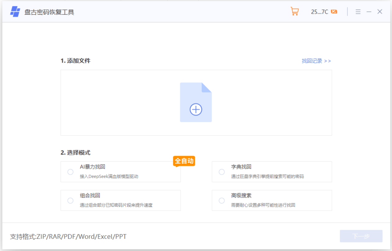 比如小编使用的盘古工具,工具里的【找回密码】模块提供了4种方法,可以用来找回常用办公软件的“打开密码”,既支持Word格式,也支持Excel、PPT、PDF等格式。