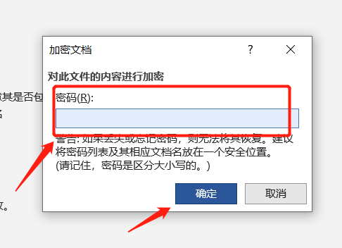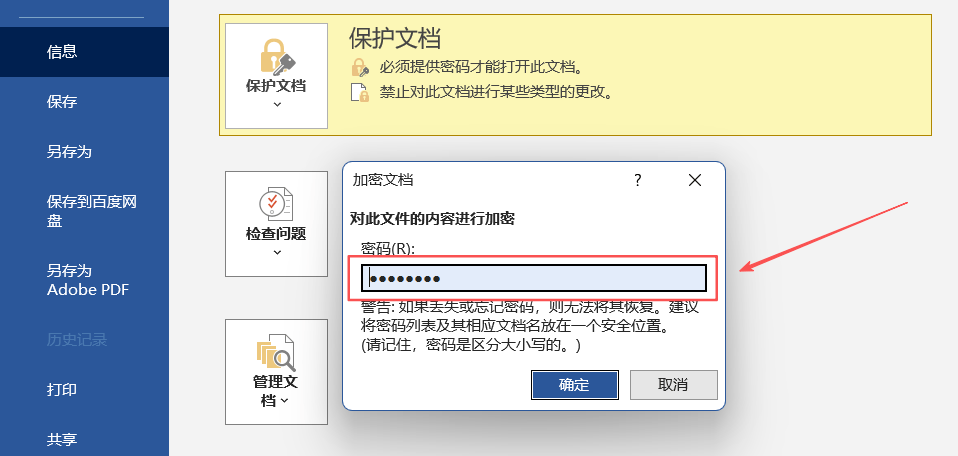 3、在弹出的对话框中输入密码,系统会要求再次输入密码,点击【确定】后保存文件,密码才会生效。