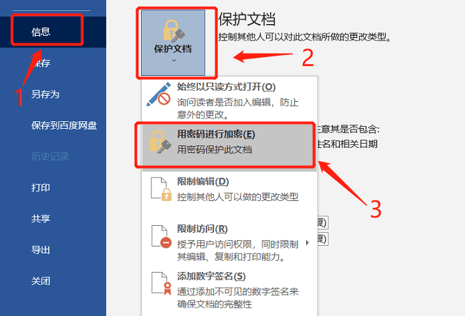 2、弹出新的界面后,选择左侧【信息】,在中间区域找到“保护文档”选项,在下拉菜单中,点击【用密码进行加密】。