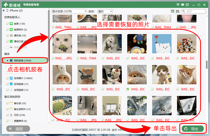 步骤4. 扫描结束后,在左侧的数据分类栏里勾选“照片”类目,这时可在右侧界面预览所有能恢复的照片(已删除的照片一般会用橙色做标识),勾选好需要找回的照片后,点击“导出”按键,设置好存储路径就能把照片导出到电脑中。