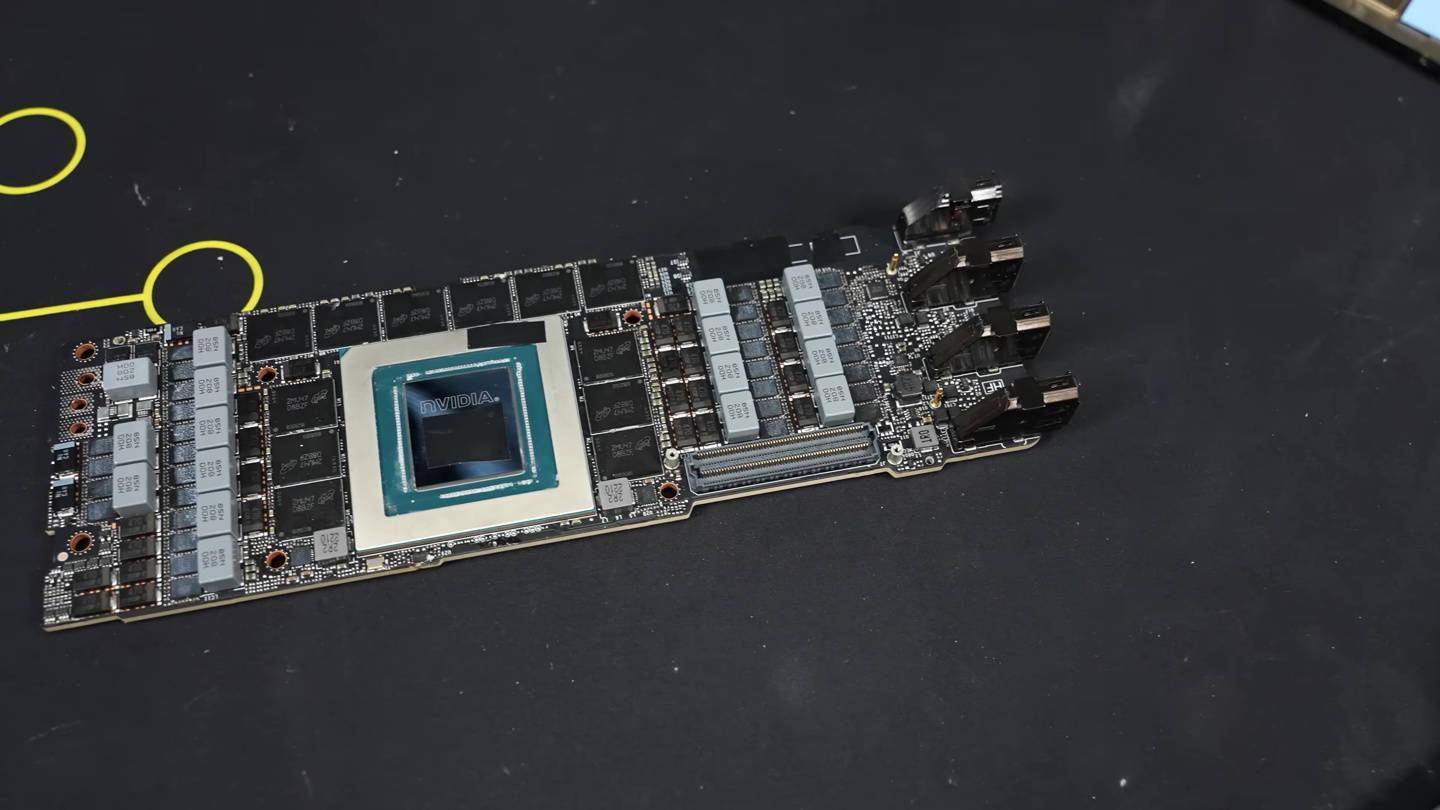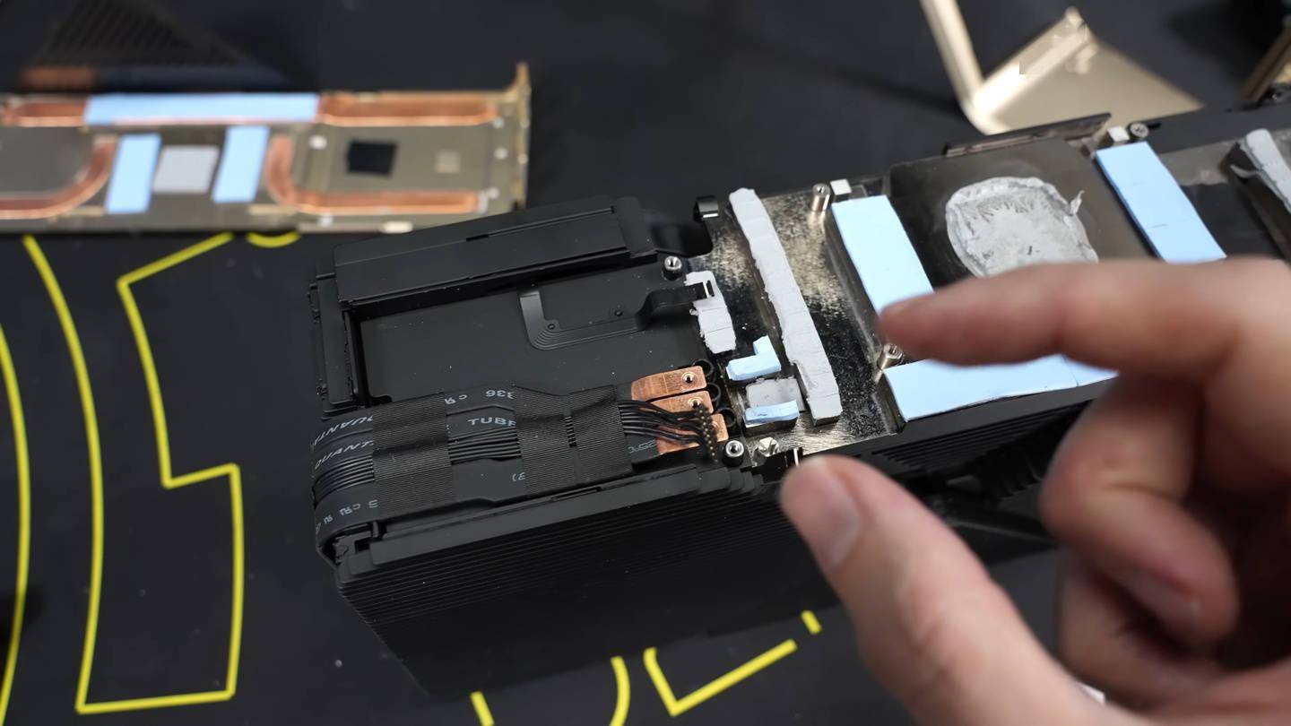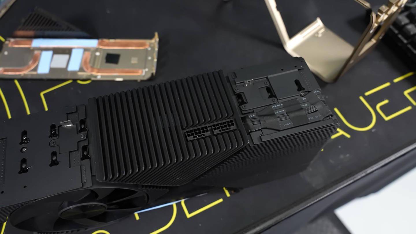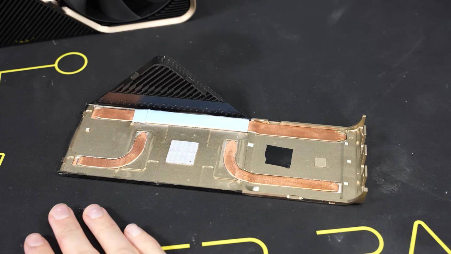 该显卡的“背板”包含了共计三根热管以改善 PCB 背面器件散热效果,这是类似布局的 GeForce RTX 4090 Ti 原型卡上未有的。