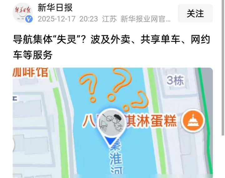 2025年12月17日傍晚,南京市区上演了一场荒诞的景象——高德、百度、苹果等主流地图软件集体罢工。许多网友纷纷吐槽导航定位一会儿飘到玄武湖,一会儿又瞬移到57公里外的句容,外卖骑手在空白的导航界面上原地打转,共享单车用户关锁时发现自己穿越到了邻近的城市,网约车司机接到本市的订单,结果显示的路程竟然有1.8万公里之远。有网友甚至调侃:人在河西喝咖啡,定位却显示在汤山泡温泉。