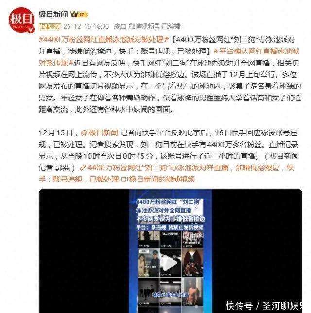 这事儿真是让人头疼!谁能想到,拥有超过4400万粉丝的快手顶流网红刘二狗,最近竟然在一次泳池派对的直播中彻底翻车。这场直播是在12月上旬进行的,本来可能是想搞点新花样,但没想到画面太过火,直接被网友痛批低俗擦边,一下子冲上了热搜榜。回想那次直播的画面,真的是让人目不忍睹。在一个蒸汽缭绕的泳池里,泳池周围挤满了穿着泳装的男女。有些年轻姑娘不断扭动身体,做出各种舞蹈动作,而男主持人只穿泳裤,手里拿着话筒与她们几乎贴面交流,同时还有各种刻意的水中拉扯、推撞,甚至直接把女嘉宾往水里扔……整个场景被渲染得异常暧昧。这根本不是普通的派对直播,一眼就能看出,这是披着派对幌子的低俗擦边球,目的显然是为了博眼球和赚流量。