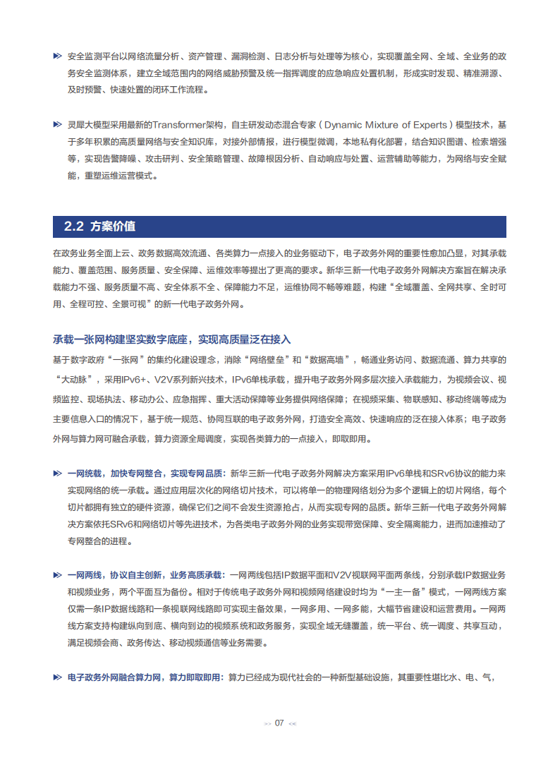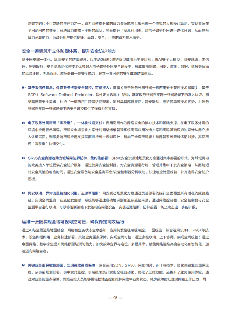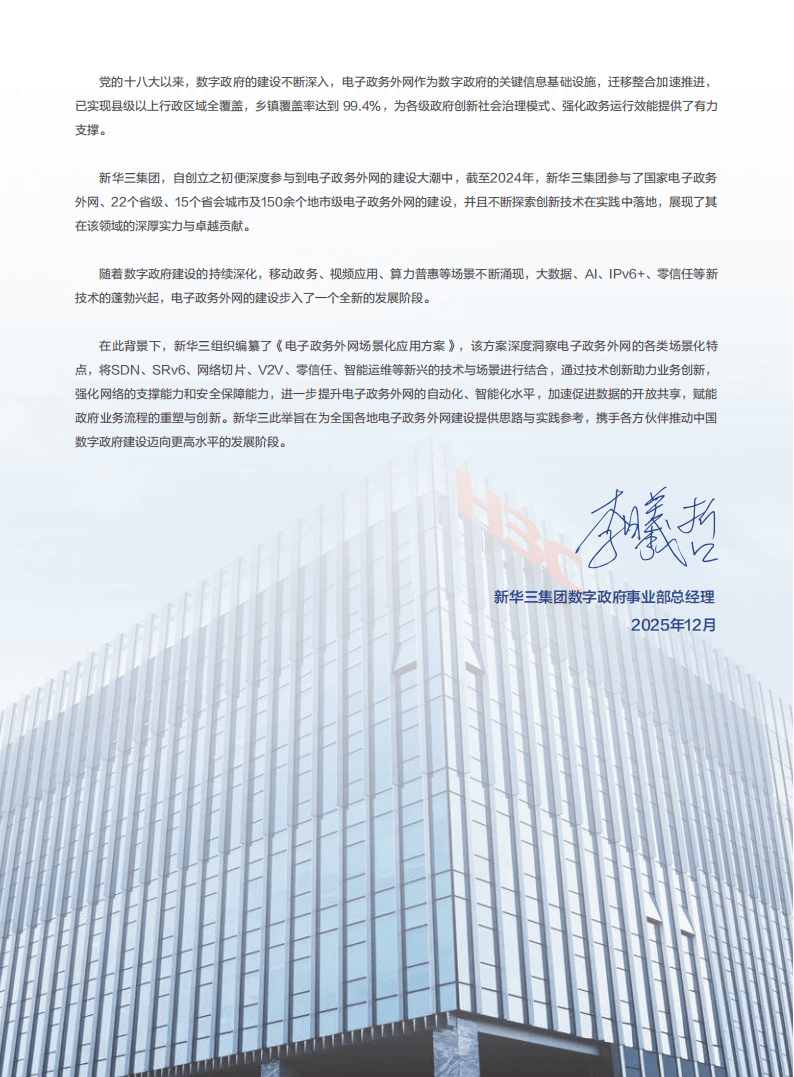 在数字政府建设持续深化的背景下,移动政务、算力普惠等场景不断涌现,大数据、AI、IPv6+等新技术蓬勃发展,电子政务外网进入全新发展阶段。新华三基于丰富的实践经验,推出电子政务外网场景化应用方案,为各地建设提供思路与参考。