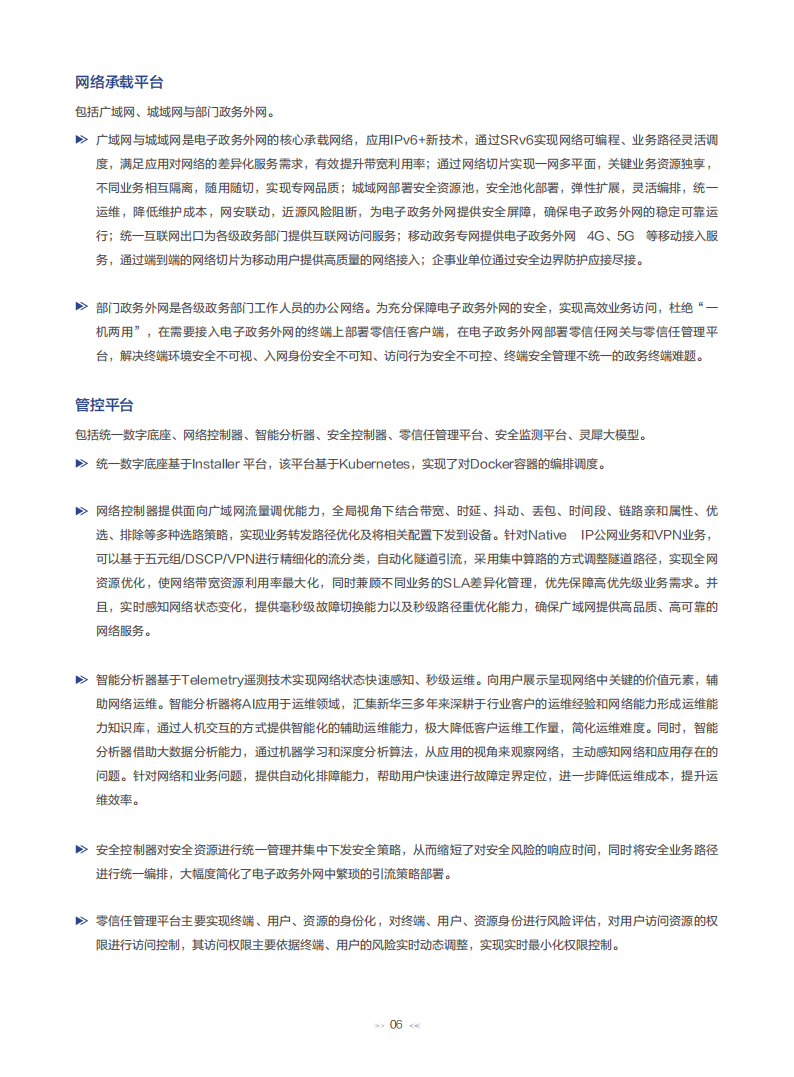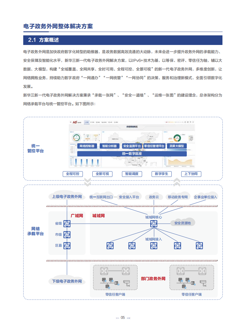 新华三解决方案以IPv6+技术为基,以等保、密评、零信任为轴,构建“全域覆盖、全网共享、全时可用、全程可控、全景可视”的新一代电子政务外网,秉承“承载一张网”“安全一道墙”“运维一张图”理念,分为网络承载与统一管控两大平台。
